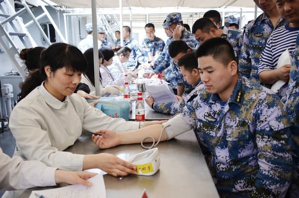 医护人员在舰上搭起了临时诊室,对官兵们的心肺、肝胆、血压等方面进行了仔细全面的诊查。对于体检中发现的问题,医护人员现场为官兵详细加以解释,并开办“男性疾病保健”健康讲座,介绍了相关的疾病知识。
