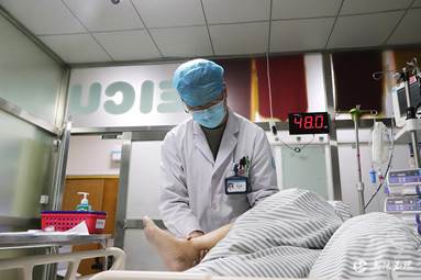 在急诊重症监护室,急诊科主治医师陈时强正在检查一位老年患者的各项身体特征。这是一位因心脏骤停而陷入昏迷的患者,陈时强已经察看该患者5个小时了。