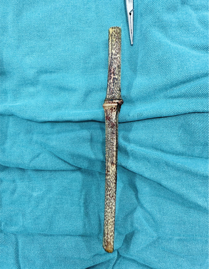 术中可见竹棍表面粗糙带泥沙,增加操作难度。医生在精细解剖下逐步分离竹棍周围组织,以毫米级精度缓慢取出异物,随后彻底清创并缝合伤口。周方建表示:“竹棍与血管仅距1毫米,操作需极度谨慎,稍有不慎即可引发大出血。”