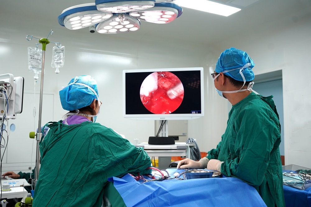 叶建英(右)开展鼻内镜下腺样体肥大切除术