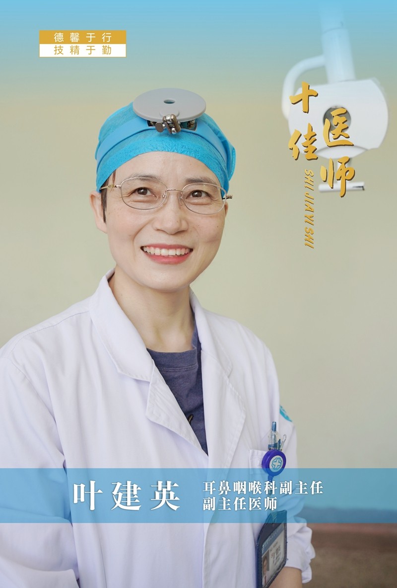 叶建英,玉环市人民医院耳鼻咽喉科副主任(主持工作)、副主任医师。从医21年,她以责任立心,凭精细立业,在耳鼻咽喉的“方寸天地”间,默默守护着万千患者的生命健康与生活质量,日前获评医院“十佳医师”荣誉称号。