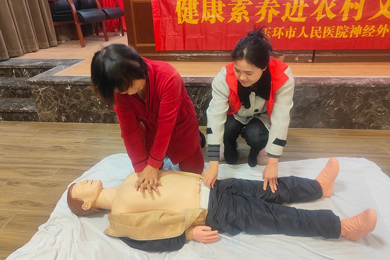 医护人员现场演示心肺复苏操作流程,手把手指导村民掌握按压部位、力度和频率等关键技巧,确保大家在紧急情况下能科学施救。