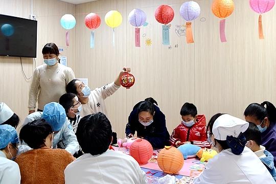 “你来选贴纸,我来做灯笼架子”“来猜猜这个灯笼上的字谜吧”……在玉环市人民医院儿科病房,趁着元宵佳节来临,2月14日下午,医护人员为小朋友们精心准备了元宵节活动。小朋友们在家长陪同下,和医护人员一起动手制作可爱的小灯笼,并通过猜灯谜等游戏,学习了中华传统文化。活动现场其乐融融,小朋友们开心地说:“这里和游乐园一样!”医护人员贴心的举动让大家在医院也能享受到过节的氛围,开心度过一个欢乐喜庆的节日。