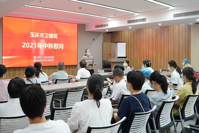 9月17日下午,在中秋节来临之际,卫健局党工委副书记林金玉来院慰问医务人员。市人民医院健共体集团名医名中医、发热门诊及方舱工作人员作为医务人员代表,齐聚学术报告厅,共庆佳节。会上,林金玉副书记为大家一一送上月饼与节日祝福。她表示,礼轻情意重,感谢在疫情特殊情况下坚守岗位的全体医务人员,希望大家能继续以最饱满的精神状态投入到工作中,积极推动医院各项工作再上新台阶。
