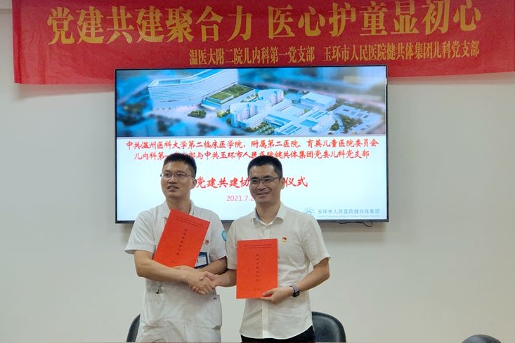 7月21日下午,市人民医院健共体集团总院儿科党支部与温州医科大学附属第二医院育英儿童医院儿内科第一党支部党建合作签约仪式在我院党建活动中心举行。温州医科大学附属第二医院育英儿童医院儿内科第一党支部书记朱将虎等四位支部委员,市人民医院健共体集团党委副书记、副院长杨善浦,总院儿科党支部书记沈仁及部分党员参加签约仪式。会上,双方支部书记简单介绍了各自支部在党建、学科发展、人才培养等方面的工作开展情况,就...