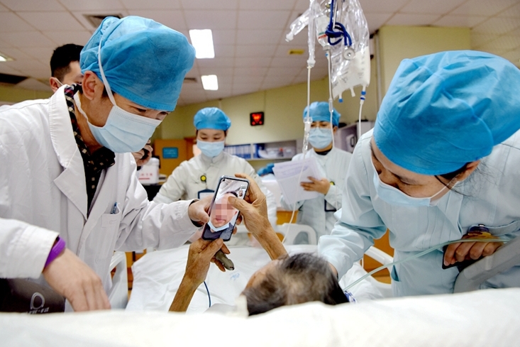 “爸!爸!你好点了吗?”在ICU昏迷了4天,听着久违的声音,望着手机里日思夜想的儿子,83岁的患者老李举起瘦削的双手,隔着屏幕,轻轻抚摸儿子的手、眼眸……“老头子,你快点好起来回家,我们都陪着你!”与儿子结束视频,应老人要求,医护人员又连线上了老人的老伴。一句句鼓励安慰,不禁让老李湿了眼眶。这一刻,日日夜夜的思念、所有的不安和恐惧,似乎都在瞬间得以治愈!由于疫情防控需要,如今,全国各家医院都严格限...