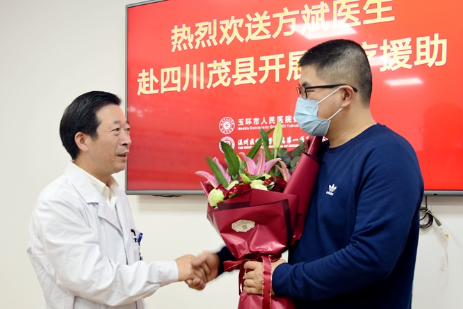 11月6日,我院在三楼小会议室召开援川医务人员欢送会,欢送医院ICU主治医师方斌同志赴四川茂县人民医院开展为期三个月的工作。医院党政领导班子参加欢送会。欢送会上,院党委书记陈增瑞为方斌同志送上了鲜花和祝福。他指出,对口支援四川医疗卫生工作是一项光荣的政治任务,希望方斌同志牢记援川使命,到岗后主动融入积极工作,充分发挥自身优势和技术专长,以实际行动造福当地百姓,同时医院也将全力支持方斌同志支医工作,...