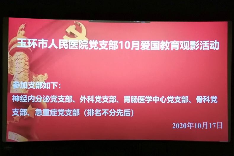 为扎实“不忘初心,牢记使命”的主题教育活动,大力弘扬爱国主义精神,加强党员的意识形态,10月17日晚7时,玉环市人民医院健共体总院神经内分泌党支部、外科党支部、胃肠医学中心党支部、骨科党支部、急重症党支部联合开展以“致敬民族英雄,弘扬抗联精神”为主题的红色观影活动。今年是中国人民抗战胜利的75周年,在那段艰苦的抗战岁月,有很多先辈舍身取义气,有很多英雄前仆后继,不断的为抗日胜利慷慨就义。而这次观影...