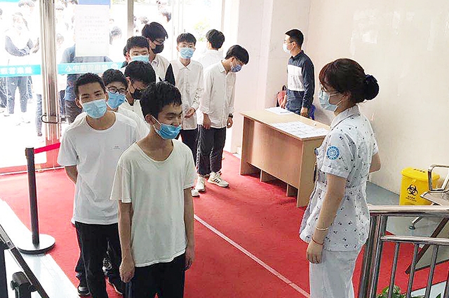“同学们,进入时请出示健康码,配合测量体温,排队保持距离……”日前,高考体检正在有条不紊地开展中。高考体检一向是普通高校招生考试录取的重要环节,据市教育局统一部署安排,今年高考体检时间为5月13日至28日。各校高三年级全体学生将于该时间段的每天中午12时后或晚上17时后接受高考体检胸片拍摄。今年加之疫情影响,时间紧任务重的体检工作更为复杂。为此,体检中心详细制定了体检胸片拍摄实施方案,抽调责任心强...