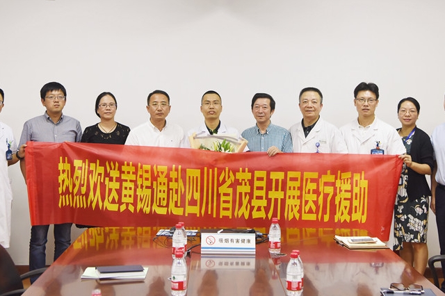近日,我院黄锡通同志主动响应上级要求,赶赴四川茂县开展为期半年的医疗援助。10月9日下午二时许,市卫计局党委书记、局长王必胜,党委副书记、副局长林金玉与医院院领导们为黄锡通举办简短的欢送仪式,送上了鲜花与祝福。我院党委书记、院长陈增瑞强调茂县是少数民族聚居县,希望黄锡通同志能入乡随俗,尽快融入当地环境,发挥自身专业优势,满足当地医疗需求。王必胜表示,人民医院能够选送作为中流砥柱的黄锡通同志参与援助...