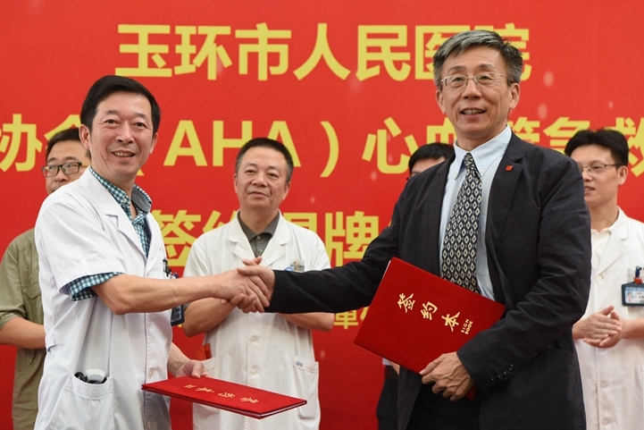 9月13日上午,玉环市人民医院在门诊大厅隆重举行“美国心脏协会(AHA)心血管急救培训中心”签约揭牌仪式。党委书记、院长陈增瑞,原国家卫计委国际交流中心处长、美国心脏协会协调员王革新共同签署合作协议,并为“玉环市人民医院美国心脏协会心血管急救培训中心”揭牌,玉环市人民医院正式成为AHA认证的心血管急救培训中心。今年4月份,“美国心脏协会心血管急救培训中心”到医院考察确定培训合作,并于9月份开始派遣...