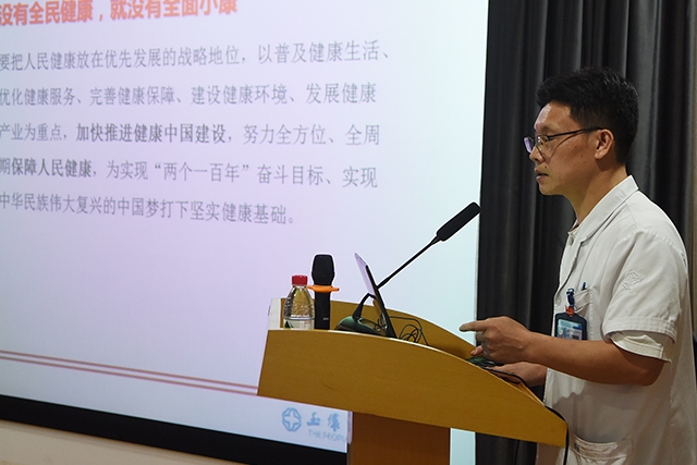 9月3日晚,内科第二党支部在三楼学术报告厅举行“主题党日”活动,会上严格落实戴党徽、交党费、读党章、学时政、过政治生日等“规定动作”。9月也是支部党员、我院副院长周朝阳的“政治生日”。在当天的活动中,周朝阳对照“初心十问”进行了初心体检,并以“不忘初心牢记使命”为主题,给党员们上了一堂精彩的主题教育党课。他主要围绕“文化自信、民族复兴,不忘初心、牢记使命,十问初心、继续前行,何以成医”四个方面阐述...