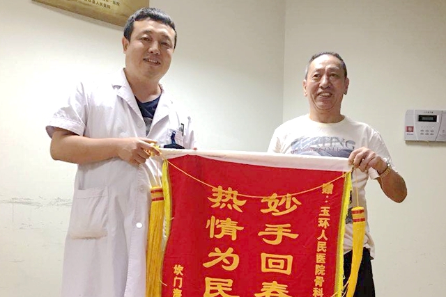 “谢谢,谢谢你们,要不是你们,我这辈子都要躺在床上了!”近日,坎门的庄老伯将一枚写着“妙手回春技术高热情为民医德好”的锦旗送到了骨科副主治医师医师龙志强的手术,不停地感谢医院骨科给了他第二次行走的机会。事情还得从半年前讲起,66岁的庄老伯不慎从高处坠落,不仅头部撞破,两条腿都不幸骨折,分别为左侧胫腓骨骨折、右跟骨骨折。正当他以为自己再也不能下地走路的时候,骨科医生却给予了他坚定的希望:“老人家,您...