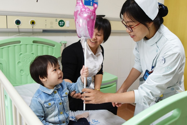 6月1日上午,我院儿科医护人员们来到病房为住院小患者送上小礼物,祝福他们早日出院。据了解,为弥补小朋友们不能参加学校“六一”活动的遗憾,医护人员们早早就筹备忙活起来,还用颜色缤纷的气球、彩旗等将儿科病区装饰一新。家长们也纷纷表示这样的活动很贴心,让小朋友们在医院也能感受到“六一”的欢乐气氛。