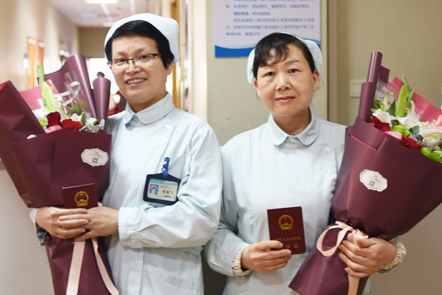 近日,妇产科门诊张智媚与陈春飞两位老师即将退休。3月28日上午,副院长陈永平、党委委员王晓军一行来到科室为两位老师送上鲜花与退休证,感谢她们为医院默默奉献的三十余年岁月。