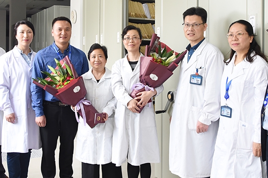 近日,病案室郭海霞与潘佩珍老师两位老师即将退休。4月3日上午,副院长周朝阳、党委委员王晓军、党委委员洪伟峰一行来到病案室为两位老师送上了鲜花与退休证。