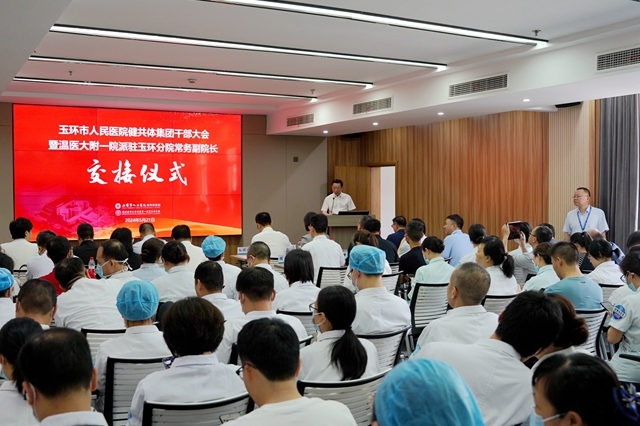 5月21日上午,玉环市人民医院健共体集团举行干部大会暨温医大附一院派驻玉环分院常务副院长交接仪式。温医大附一院派驻我院的冯建武同志卸任常务副院长一职,由陈必成同志接任。玉环市副市长奚圣懂;温医大附一院党委委员、副院长孙维建;玉环市市府办副主任陈剑峰;玉环市卫健局党工委书记、局长卓桂娥,党工委副书记林金玉,党工委委员罗永松出席会议。会议由集团党委书记陈增瑞主持,玉环市人民医院健共体集团全体中层以上干...