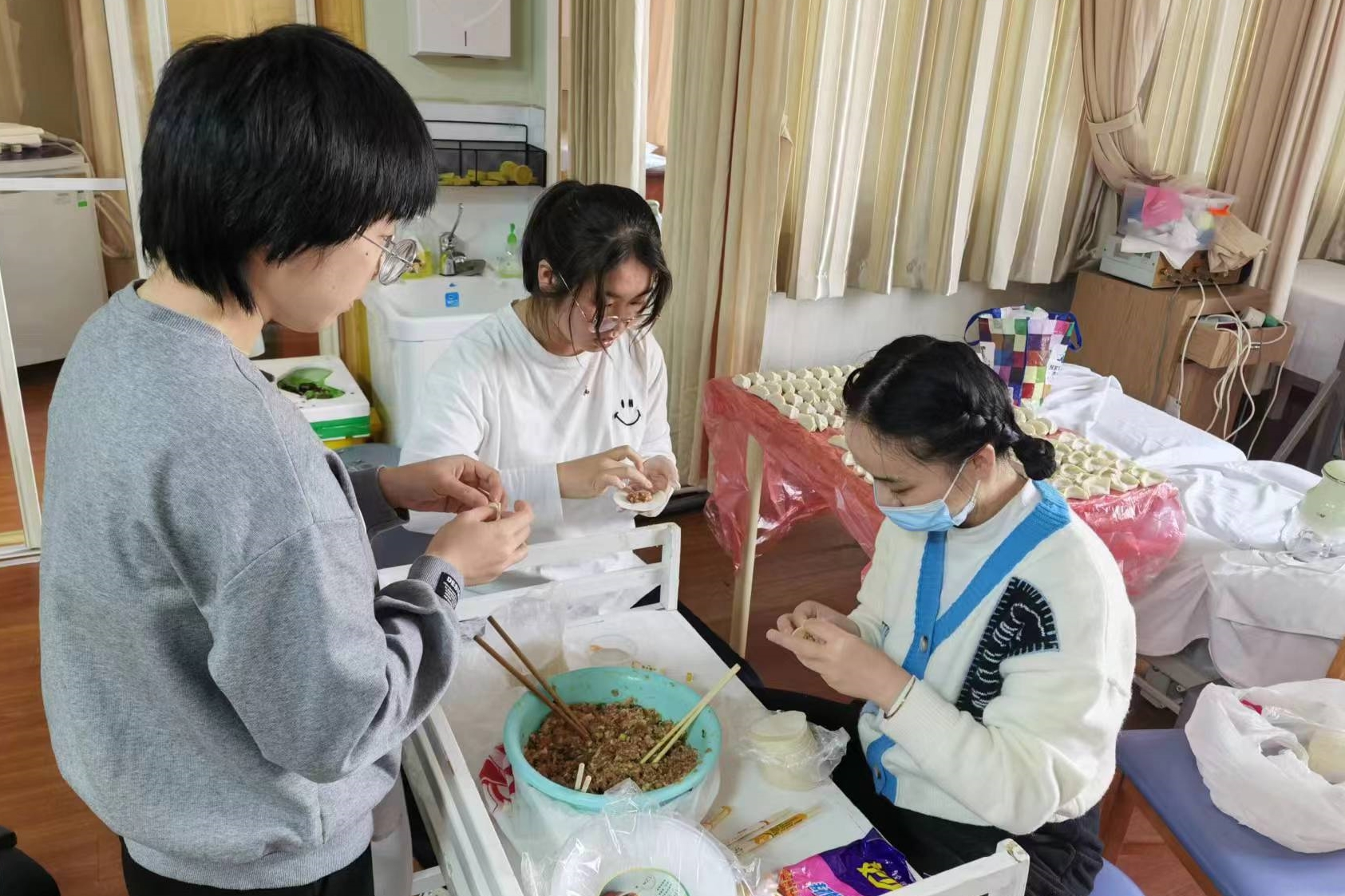 1月15日是农历腊月二十四是南方小年,常有吃饺子的习俗,意为给灶王送行,取义“送行饺子迎面风”,吃着热乎乎的饺子,其乐融融,才有年味儿。当天上午,康复医学科的小年轻们准备食材包好饺子,并将热腾腾的饺子送到康复病人以及那些照顾病人没能回家的家属和护工手中,为大家带去来年祝福,祝患者来年康复健康,顺利回归社会。