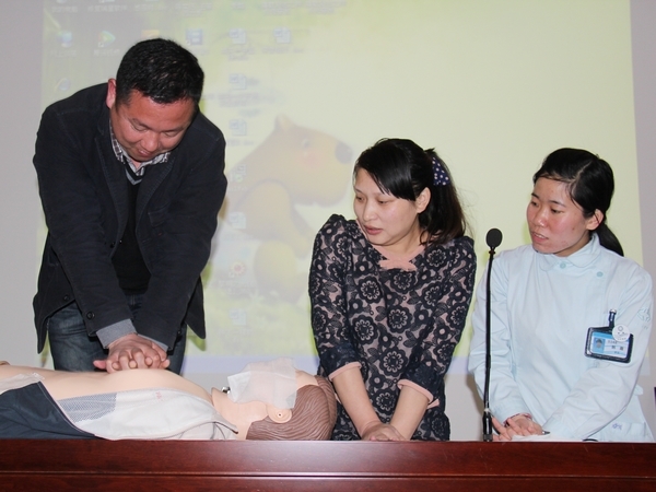 4月8日下午,玉环县人民医院医务人员到玉环县城关第一中学为教师普及急救知识。此次培训内容主要包括救护新概念、现场心肺复苏术及交通伤、动物咬伤、中暑、溺水等常见急症及意外伤害的急救处理等。医护人员采取讲解、操作、演示等形式让老师们参与其中,旨在培养老师应急救护的意识,熟知急救方式,掌握自救互救技能。图为老师在医务人员的指导下,体验心肺复苏的实践操作。