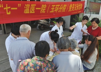 6月25日,县人民医院门诊医技第二党支部组织党员志愿者医疗队,并邀请了温州医科大学附属第一医院的专家一起来到偏僻的海岛鸡山乡,开展迎“七一”送医下乡活动。图为党员志愿者为岛上群众进行测血糖、量血压。
