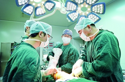 浙江省玉环市人民医院骨科青年医生为病人做人工髋关节置换手术。段俊利摄/光明图片