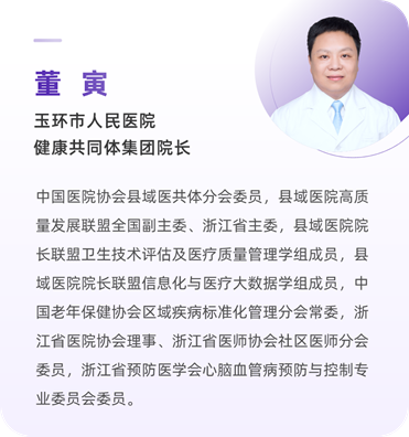 本期医管 talk 节目特别邀请玉环市人民医院健共体集团院长董寅先生,分享县域医共体的高质量发展情况,探讨医院在县域慢病管理方面的经验与对策。