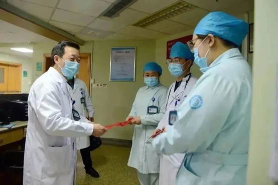 “过年好!大家辛苦啦!给大家拜年啦!”一声声暖心的问候直抵人心。每到一处,院领导都与坚守一线的医务人员亲切交谈,详细了解在院患者情况,特别是危重病人的救治,对大家在新春佳节期间舍小家顾大家,坚守一线、践行医者使命致以崇高敬意和由衷感谢,并送上慰问品和新年红包。