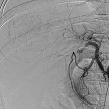 患者被送入导管室后,郑胜与放射科主治医师苏维杰第一时间开始经股动脉肝动脉造影与栓塞术。术中用碘化油及明胶海绵颗粒对出血动脉进行了栓塞,成功止血。