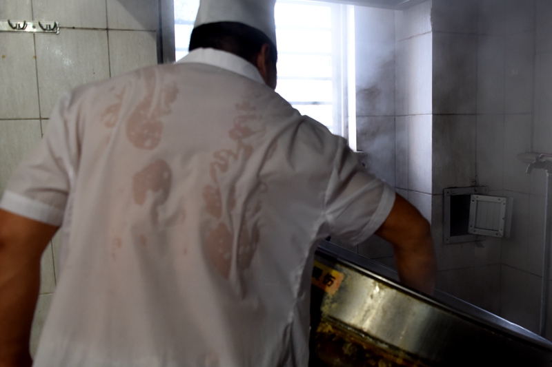 厨房里机器声隆隆不断,嘴巴凑在耳边才能听清对方说什么。这里的厨师炒菜,是以箩筐计的,炒菜的铲和铁锹一样大。