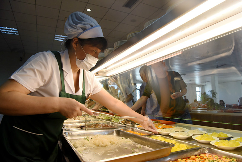 “食堂的员工们每周仅休息一天,最近缺人,蒸煮厨师周寿吉主动要求不休、每天上班;每天要清洗2000多个盘碗,洗碗工没招到,大伙儿一块洗……”食堂负责人张环萍说起食堂的事,满是感动。
