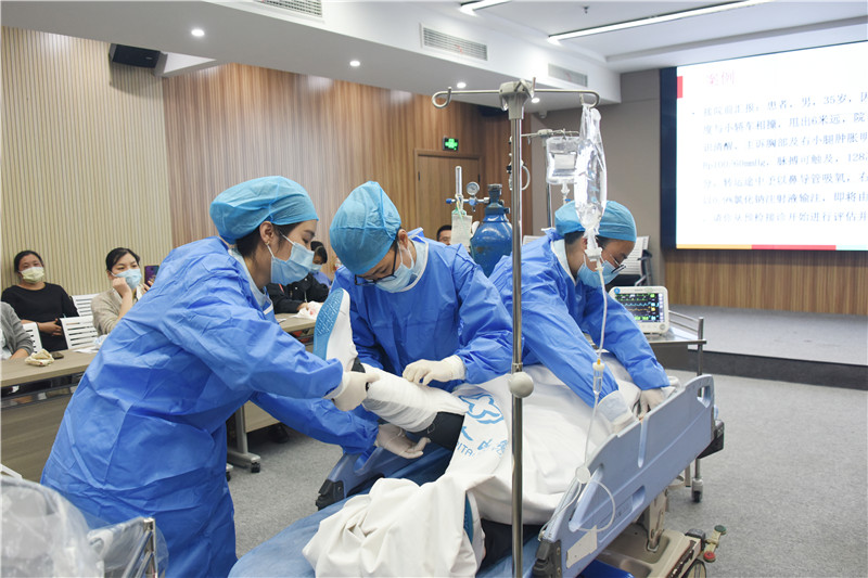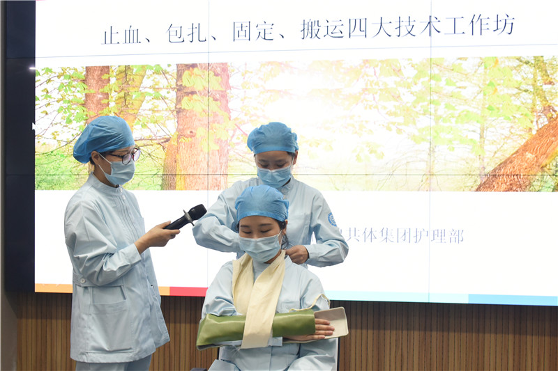 当天,学习班共组织开展过敏性休克模拟情景演示、创伤救治(止血、包扎、固定、搬运)四大技术的要点分析及三角巾的操作演示、创伤救护情景演练三大工作坊,生动形象地展现了心肺复苏、骨髓腔穿刺、轴线翻身、转运等应急救治关键技术。