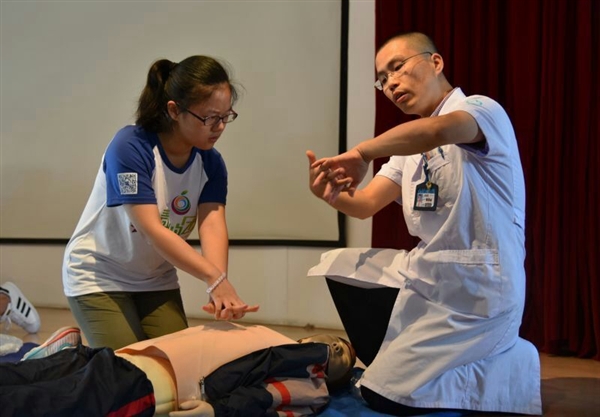 7月22日,玉环“青柚团”暑期大学生急救技能培训在县卫计局举行,我院医务人员应邀前往,讲授系列应急救护知识、心肺复苏技能等。急诊科主任黄锡通担任此次活动主讲。培训开始,他通过展示急救现场图片和讲解人体解剖构造引发全体学生学习兴趣,再以“咸鱼池淹死人”事件为例,一步步深入讲解急救步骤和注意事项,并着重讲解了止血、包扎、固定、搬运四大急救技术。医务人员还为学生们进行了心肺复苏技能培训。在黄锡通主任和儿...