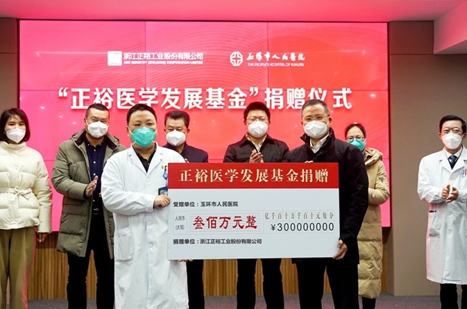 1月3日下午,玉环市人民医院举办“正裕医学发展基金”捐赠暨2022年度“正裕医学奖”颁奖仪式。市委常委、宣传部部长郑波出席仪式并讲话。市慈善总会会长陈明迪、市府办副主任蒋招林、正裕公司董事长郑念辉、管理中心总监杨华珍,市卫健局党工委副书记林金玉,以及医院领导班子、中层干部、员工代表参加了活动。党委委员、常务副院长冯建武主持仪式。“正裕医学发展基金”捐赠捐赠仪式上,浙江正裕工业股份有限公司向玉环市人...