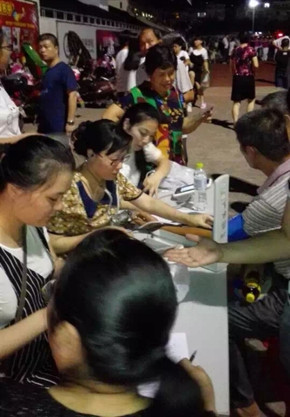 下午6点多,党员志愿者在体育馆田径运动场搭起了义诊台,不一会儿义诊场面火热了起来,测血压、测血糖、健康咨询和就诊的群众络绎不绝。