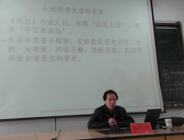 “足够的睡眠对人体非常重要,作息时间无规律、睡眠不足,让人容易衰老。”蔡主任借助多媒体,运用通俗的讲述,从中医养生的基本法则以及实施要点进行讲解。老师们听得很认真,有的记着笔记,有的默默点头。