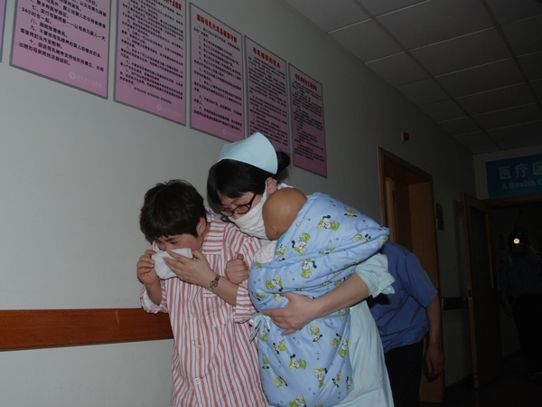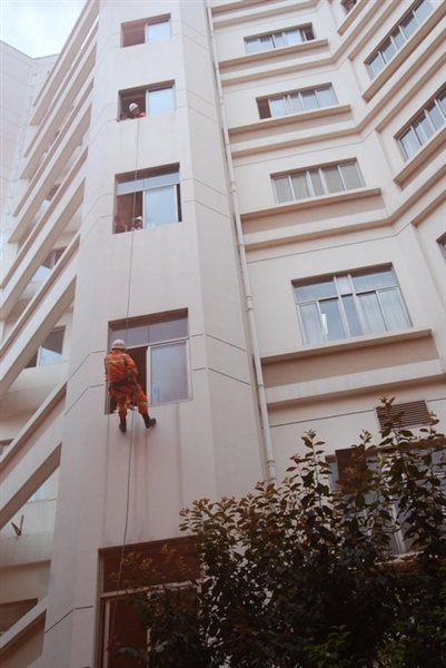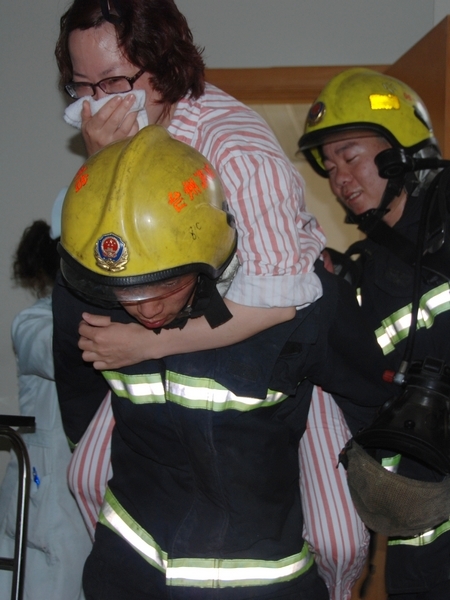 玉环消防大队119指挥中心接到报警后,迅速出动2辆消防车、6名消防官兵到场实施扑救,并用水枪堵截火势,防止蔓延;救援组深入每个病房寻找被困人员。“快救救我和我的孩子啊……”忽然,在三楼楼梯间,一名产妇抱着婴儿趴在窗口向外求救,正在四楼搜救的消防官兵听到呼声,立即绑上安全绳,从四楼“飞檐走壁”而下解救婴儿,产妇则在另一名消防队员的带领下离开大楼。同时120急救中心迅速对伤员进行救护。经过全体人员努力奋战,“火灾”被扑灭,被困人员全部被“解救”,无人员“伤亡”。