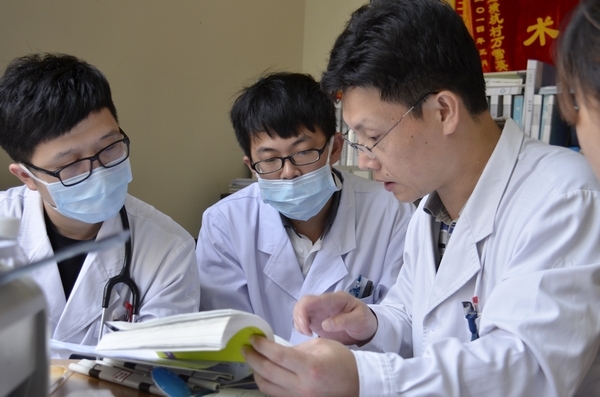 5月25日上午,笔者走进玉环县人民医院ICU,周朝阳身着白大褂,正在与科内医生们讨论重病人的治疗情况,只见他一丝不苟,满头大汗。十几平方的医生办公室堆满资料书籍,放眼墙上叠加挂着十几面锦旗。