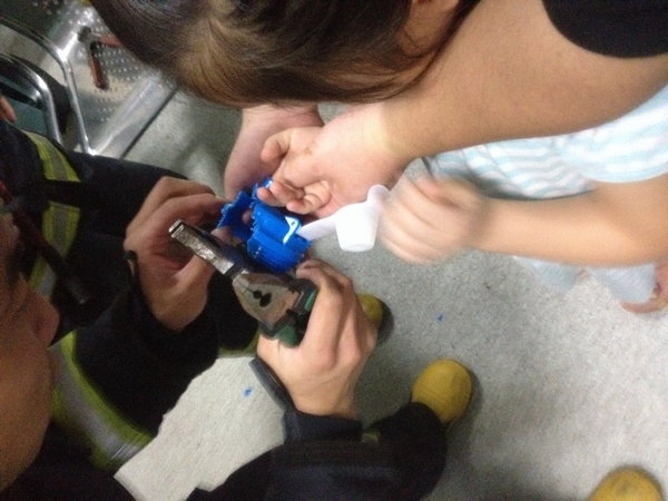 原来,小女孩今年6岁,当晚她喝完水拿着水壶玩玩看,壶嘴如自己的手指般粗,于是好奇地将手指伸进去。想不到用力过猛,手指戳进去了出不来。焦急的家长百般尝试,均无法帮孩子取出手指,只好求助消防官兵。